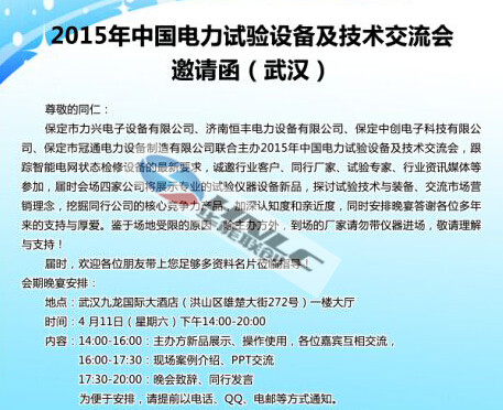 由保定和濟(jì)南的四家公司主辦,武漢鴻志協(xié)辦的2015年中國電力試驗及技術(shù)交流會將于明天在武漢舉辦。