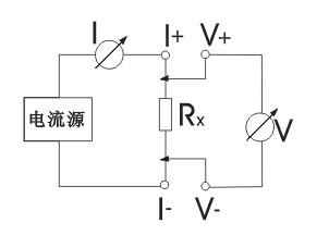 由電流源經“I+、I-兩端口(也稱I型口),供給被測電阻Rx電流,電流的大小有電流表I讀出,Rx兩端的電壓降“V+、V-”兩端口(也稱V型口)取出,由電壓表V讀出。通過對I、V的測量,就可以算出被測電阻的阻值。
